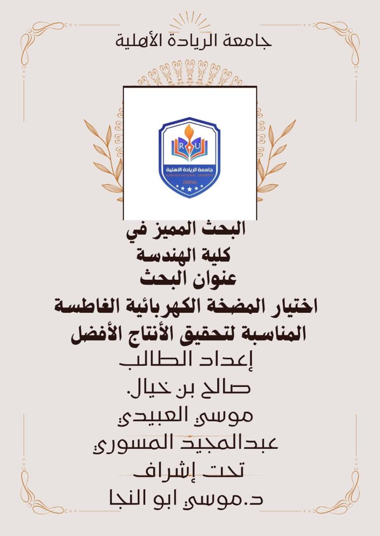 تم اختيار البحوث المميزة في البرامج الأكاديمية بجامعة الريادة الأهلية – درنة وفق معايير الجودة المعتمدة، وبعد مراجعة وتقييم البحوث المقدمة من قبل اللجان المختصة في مكتب الجودة، حيث تم التركيز على جودة المحتوى العلمي، وأصالة البحث، ومنهجية الإعداد، ومدى تحقيقه لأهداف البحث العلمي وخدمة العملية التعليمية.